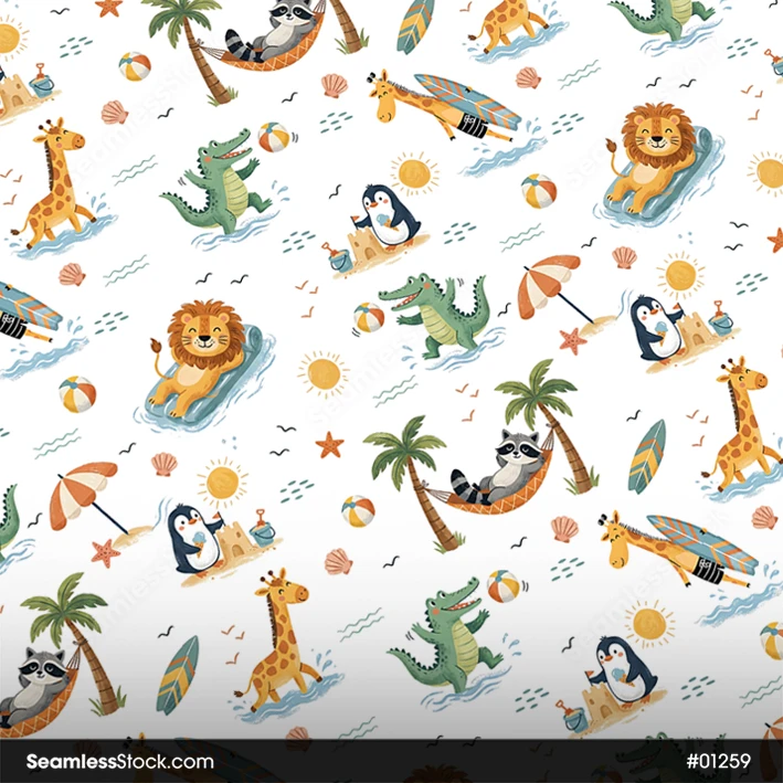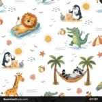 Get ready for the ultimate tropical bash with this Animals On Summer Party Seamless Pattern! 🦁🌴 This vibrant design features a joyful crew of animals—from lions in sunglasses to zebras with beach balls—all celebrating under the sun. It is an ideal choice for summer-themed children’s apparel, birthday party decor, poolside accessories, and festive gift wrap. The bright, energetic colors and playful characters create a sunny and cheerful atmosphere that brings a touch of wild vacation fun to any creative project. ✨☀️