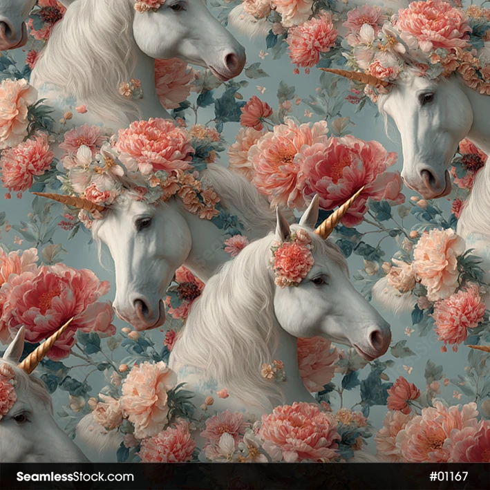 Add a magical vibe to your creations with this Beautiful Unicorns And Flowers Seamless Pattern! 🦄 A perfect pick whenever you need unicorns. 🌸