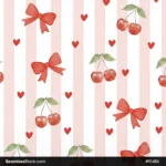 Cherries, Bow Ties And Stripes Seamless Pattern with cherries and bow ties in a striped seamless repeat, perfect for fabrics, wrapping paper, wallpapers and playful design projects. 🍒🎀