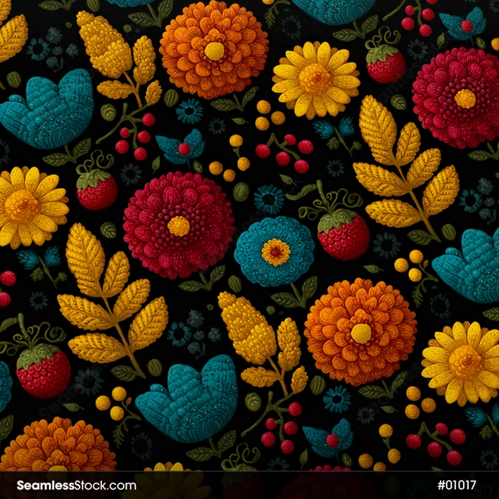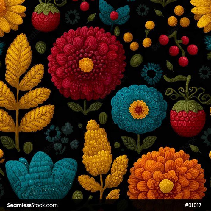 Bring bold elegance to your designs with this colorful floral on black background seamless pattern! πΊπ€ Vibrant flowers pop against a dark backdrop, creating a striking and dramatic effect. Perfect for fabrics, stationery, home decor, and digital projects that need a touch of sophistication.