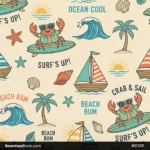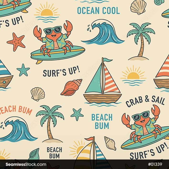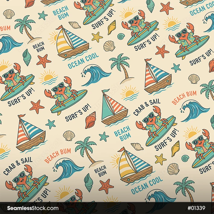 Create fun designs with this crabs and boats seamless pattern, perfect for fabrics and wrapping paper, ideal for kids projects. 🦀⛵