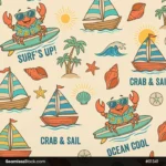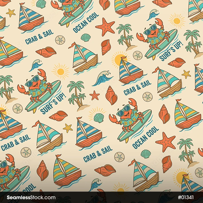 Create fun designs with this crabs and boats seamless pattern, perfect for fabrics and wrapping paper, ideal for kids projects. 🦀⛵