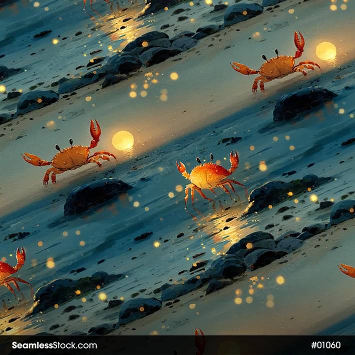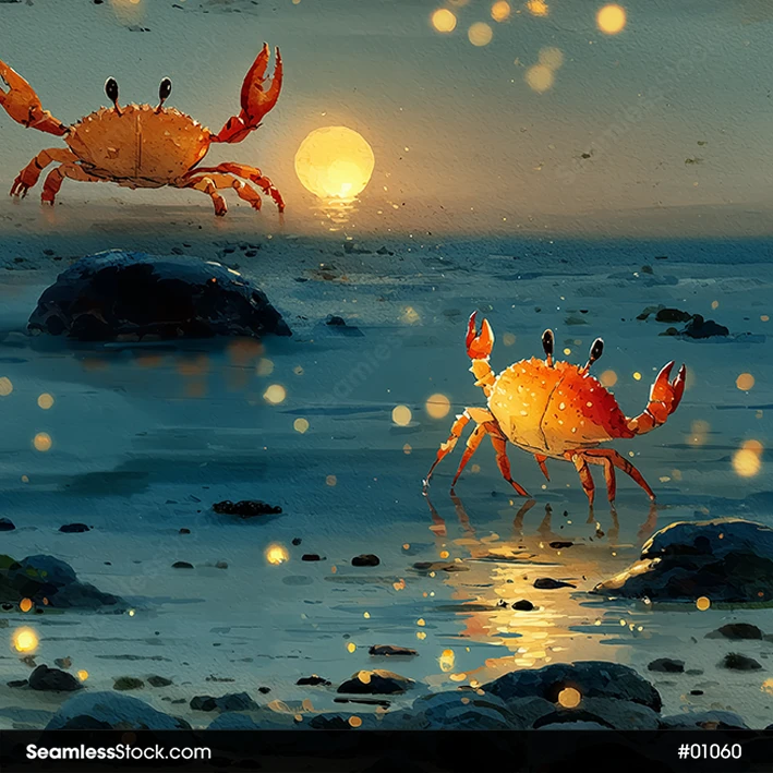 Enhance your projects with the tropical charm of this crabs on sunset beach seamless pattern! 🌊☀️ A fun and colorful choice for textiles, prints, or creative backgrounds.