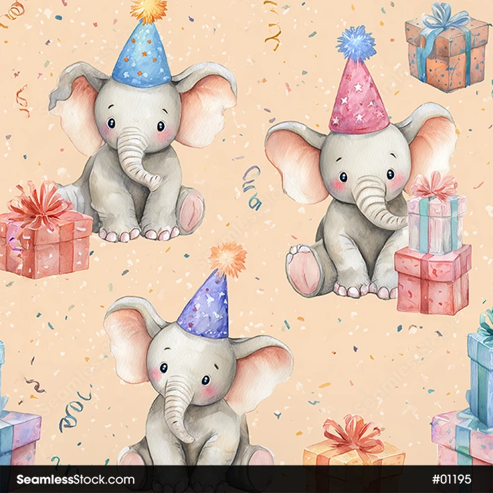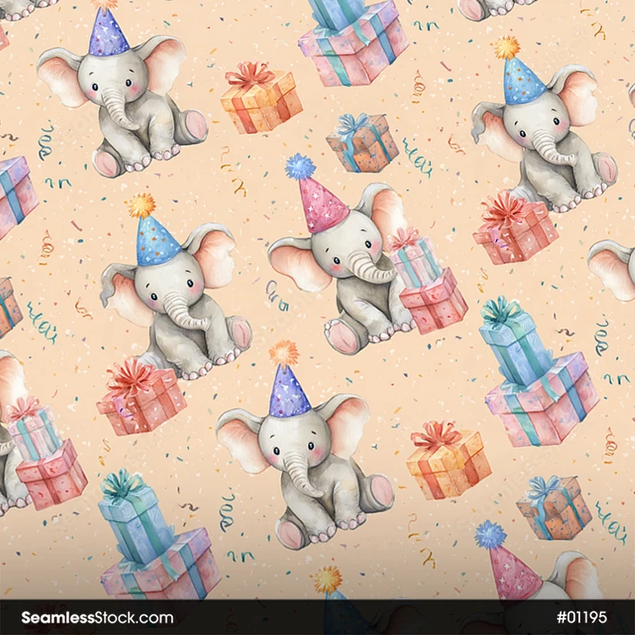 Add a festive touch to your work with this Cute Elephants On Birthday Party Seamless Pattern! Perfect for party decor and kids’ textiles. 🐘🎁