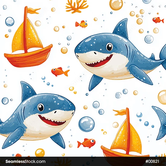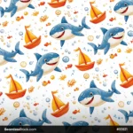 This Cute Sharks And Boats, Deep Sea Illustration Seamless Pattern is ideal for playful designs with a marine vibe that kids and sea lovers will adore. 🌊🐟🧸