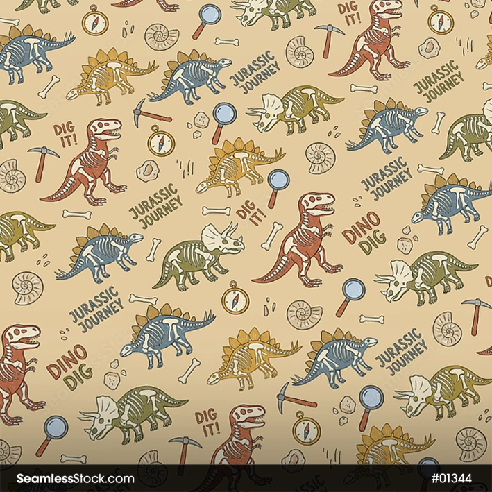 Create fun designs with this dinosaurs skeletons seamless pattern, perfect for fabrics and wrapping paper, ideal for kids projects and educational themes. 🦖🦴
