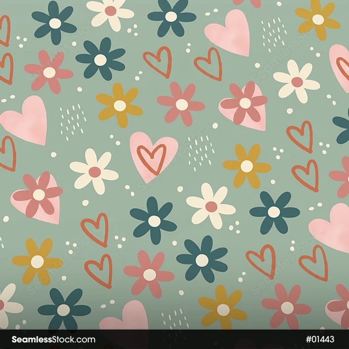 Fun and light, this flowers and hearts seamless pattern is perfect for textiles, decor, stationery, and cheerful creative designs with a cute handmade vibe. 🌸❤️✨