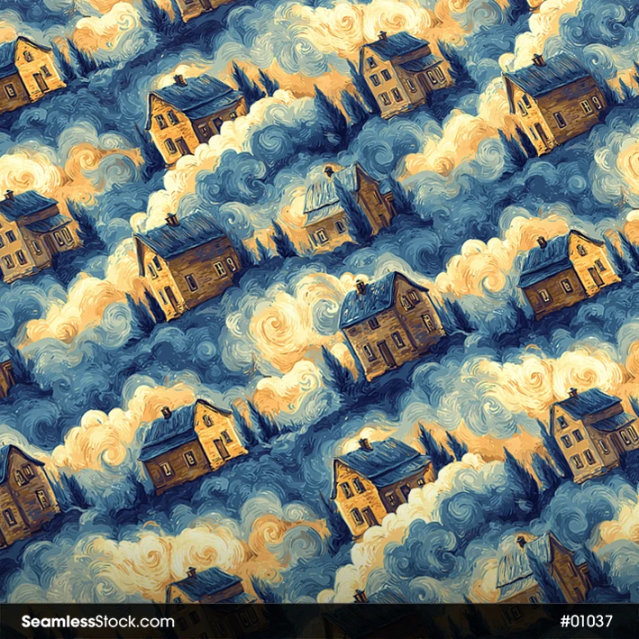 Add a creative and painterly vibe to your projects with this houses and clouds on Van Gogh style seamless pattern! 🏡🎨 Ideal for unique and art-inspired designs.