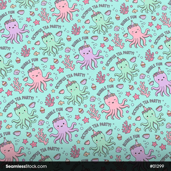 Party octopuses seamless pattern made for kids products, fabrics, wallpapers and playful prints. Clean seamless repeat in high resolution, easy to use on clothing, accessories, stationery and home decor. Ideal for print on demand, digital projects and colorful collections with a fun ocean party vibe full of energy and charm. 🐙🎉