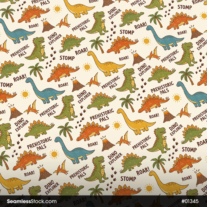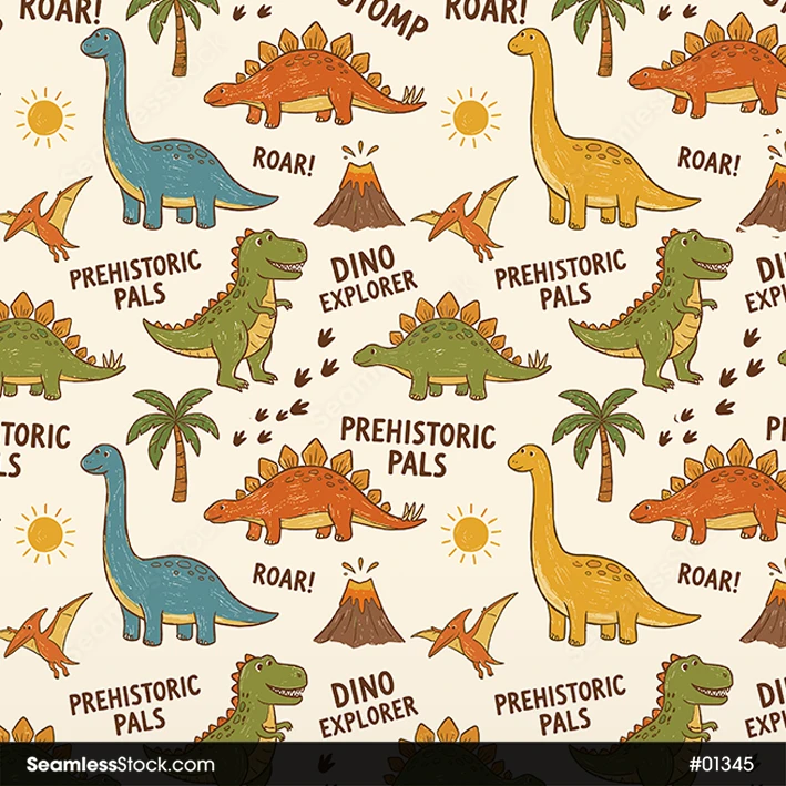 Create fun designs with this playful dinosaurs seamless pattern, perfect for fabrics and wrapping paper, ideal for kids projects. 🦖🦕