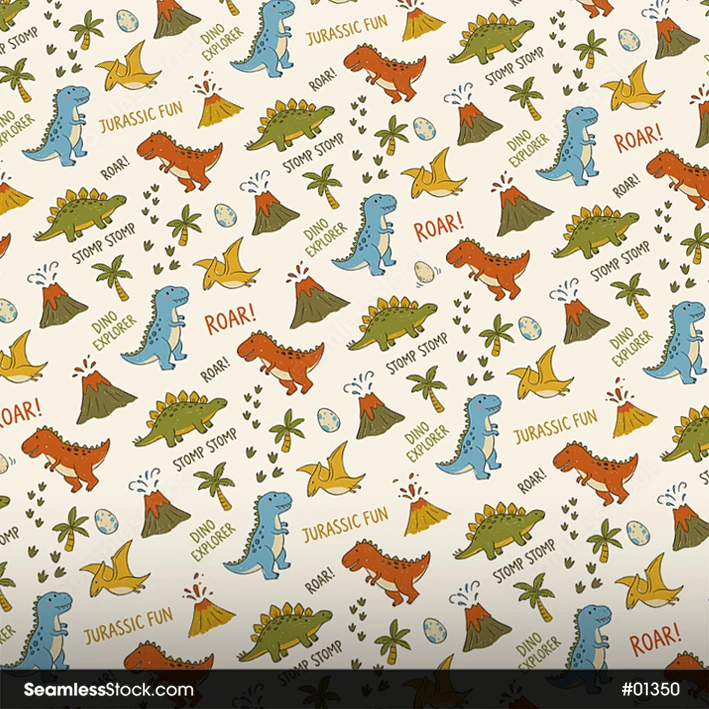 Create fun designs with this playful dinosaurs seamless pattern, perfect for fabrics and wrapping paper, ideal for kids projects. 🦖🦕