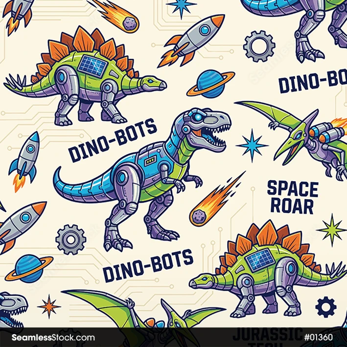Use this Robot Dinosaurs Seamless Pattern for fabrics, wallpapers, kids products, and digital designs with robot dinosaurs in a playful futuristic repeat. 🤖🦖