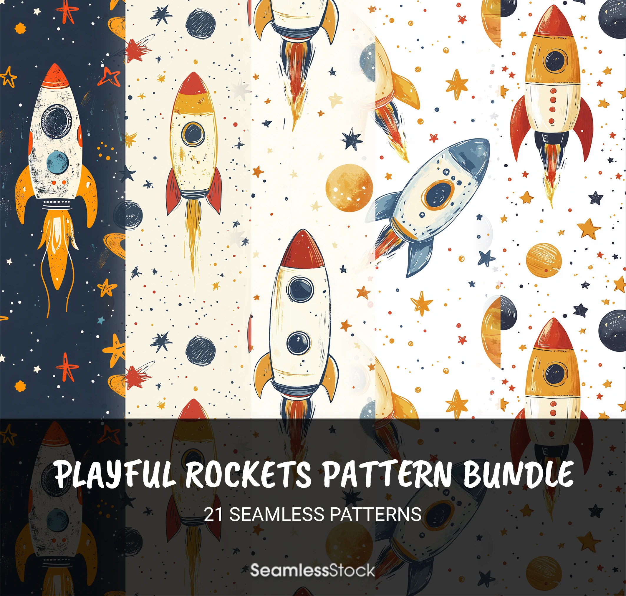 Enhance your projects with the Rockets Pattern Bundle, including 21 seamless patterns that inspire creativity and fun. ⭐✨🪐