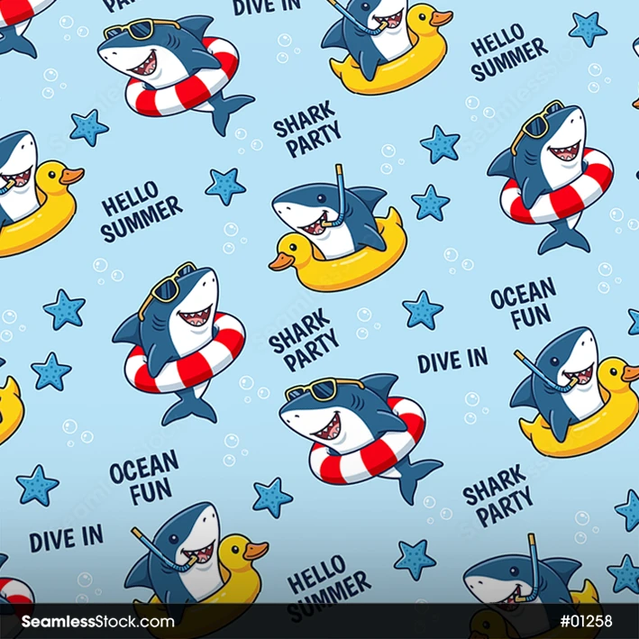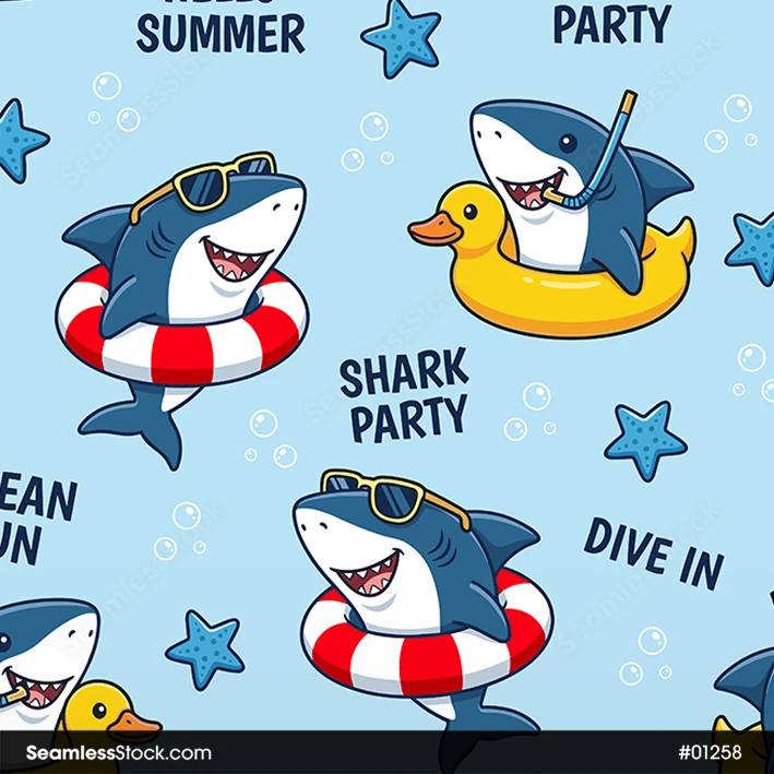 Add a burst of aquatic celebration to your work with this Sharks On Pool Party Seamless Pattern! Perfect for party accessories and summer fabrics. 🦈💦