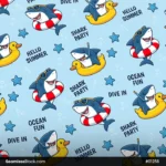 Make a splash with this Sharks On Pool Party Seamless Pattern! 🦈🎈 This festive design features friendly sharks lounging on colorful pool floats and wearing party hats, capturing the ultimate summer celebration atmosphere. It is an ideal choice for birthday party invitations, summer-themed swimwear, poolside decor, and playful gift wrap. The vibrant turquoise water and cheerful characters create a joyful and refreshing look that brings a touch of tropical fun to any creative project. ✨🌊