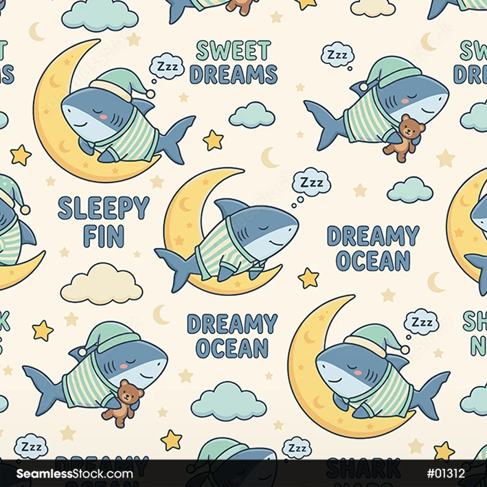 Create calm designs with this sleeping sharks seamless pattern, perfect for fabrics and wrapping paper, ideal for kids projects and relaxing ocean themes. 🦈💤