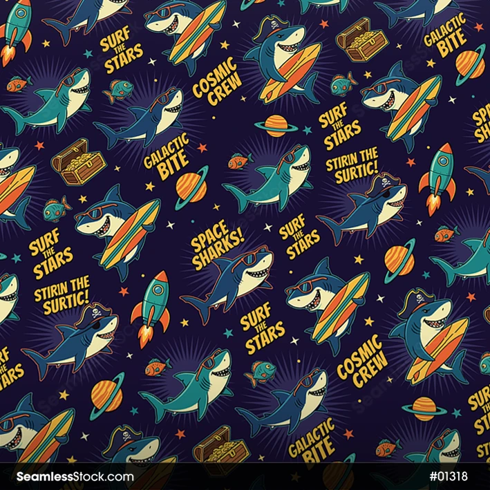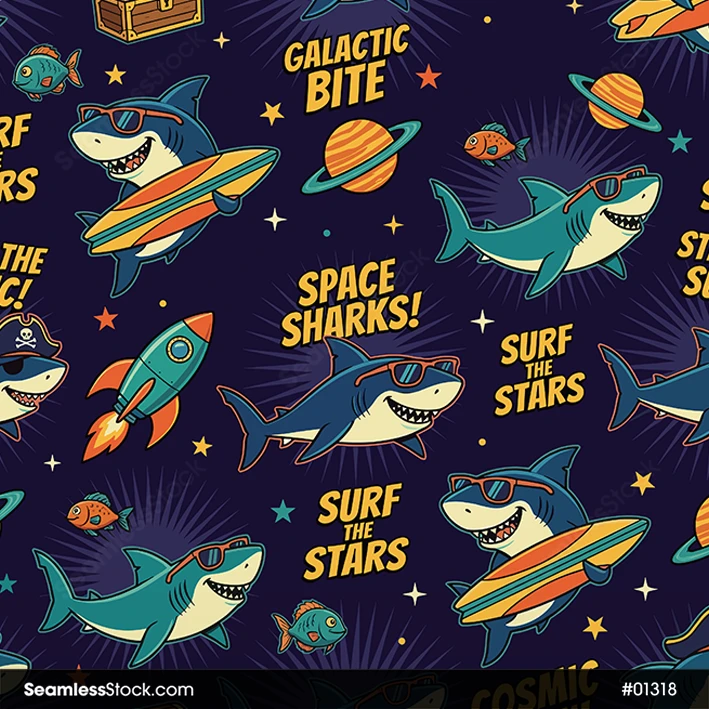 Create fun designs with this space sharks seamless pattern, perfect for fabrics and wrapping paper, ideal for kids projects and playful space themes. 🦈🚀
