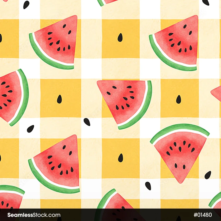 Watermelons On Plaid Background Seamless Pattern featuring repeating watermelons over a plaid background, perfect for fabrics, wallpapers, stationery and summer prints. 🍉🟥